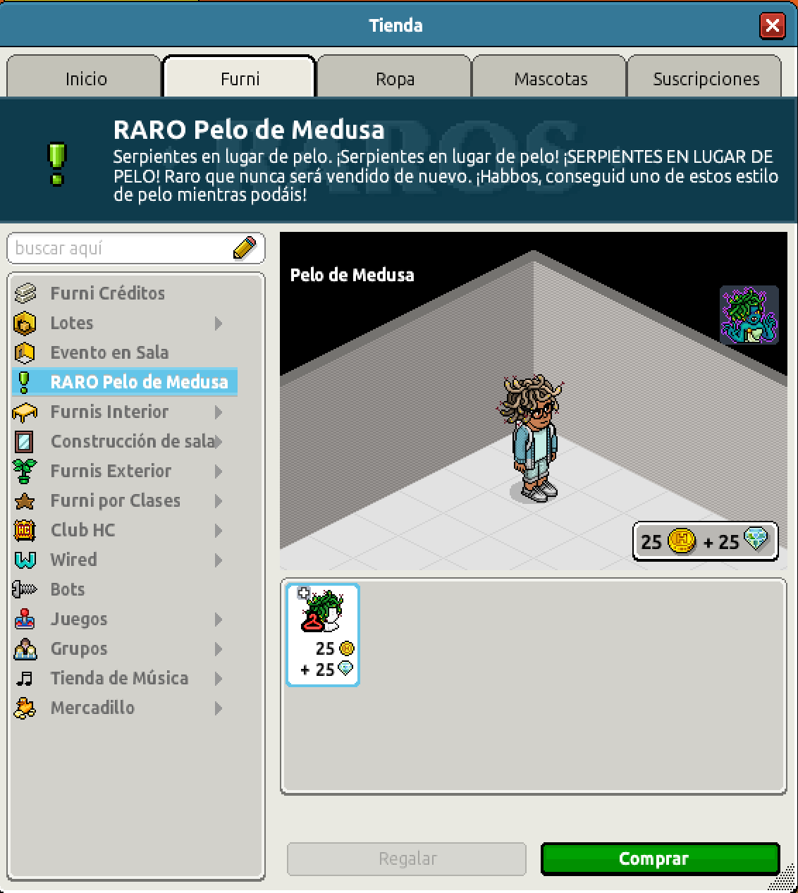 Estamos hablando del RARO Pelo de Medusa ¡Serpientes en lugar de pelo! Habbo afirma que este raro no será lanzado de nuevo a la venta así que aprovecha la oportunidad. Puedes hacerte con una unidad por tan solo 25