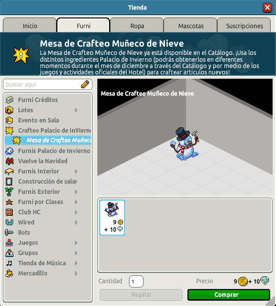 Ya están disponibles los crafteos que te hemos ido anunciando hace semanas. Con estos, como es normal, podrás conseguir cinco figuras de hielo doradas. Solo tendrás que dirigirte al catálogo, y comprar el furni ‘Mesa de Crafteo Muñeco de Nieve‘, pues es necesario para poder realizar todas las combinaciones posibles. Úsalo junto a los diferentes ingredientes. Sin nada más que añadir, os dejamos con la información a continuación: