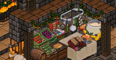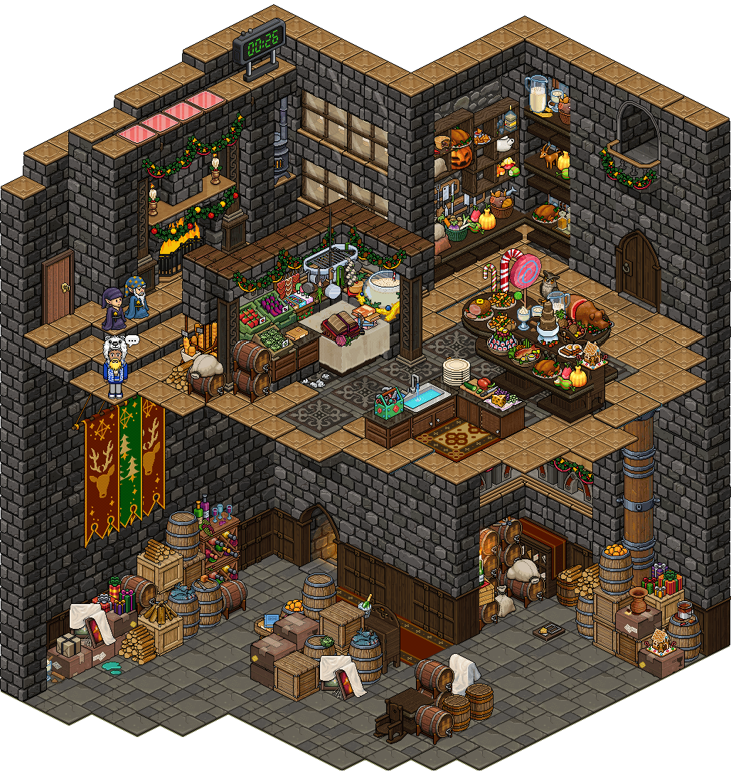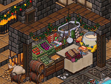Nos adentramos en el juego número 4 de este maravilloso castillo y nos encontramos en una sala de Frission, una excelente constructora del Hotel Anglosajón. En ella podemos apreciar la construcción de una magnifica cocina hecha con un montón de furnis distintos. Lo impresionante es como con furnis tan distintos y de tantas categorías distintas logra hacer una cocina con los libros de recetas y que ocupe tan poco espacio.