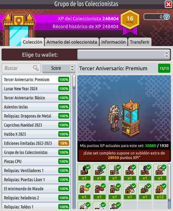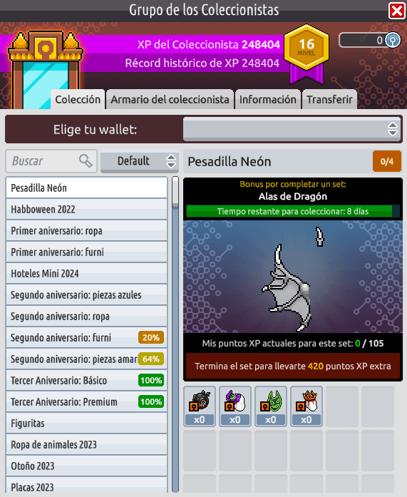 En la pestaña ‘Colección‘ de la ventana del ‘Grupo de los Coleccionistas‘ se han añadido una barra de búsqueda y tres filtros de búsqueda de sets de coleccionables: