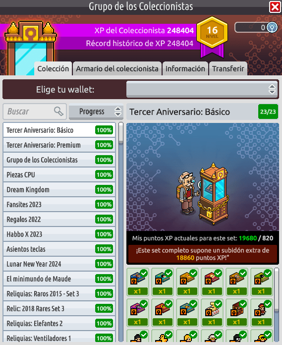 – Progress: aparecen ordenadas de mayor a menor porcentaje de completar estas colecciones.