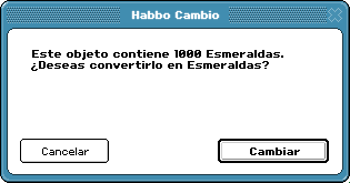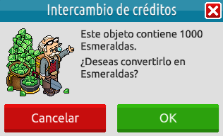 Por otro lado, también se pueden canjear furnis de esmeraldas dentro de Habbo. Para ello, colócalo en una sala y haz doble clic en este, y aparecerá el siguiente mensaje: