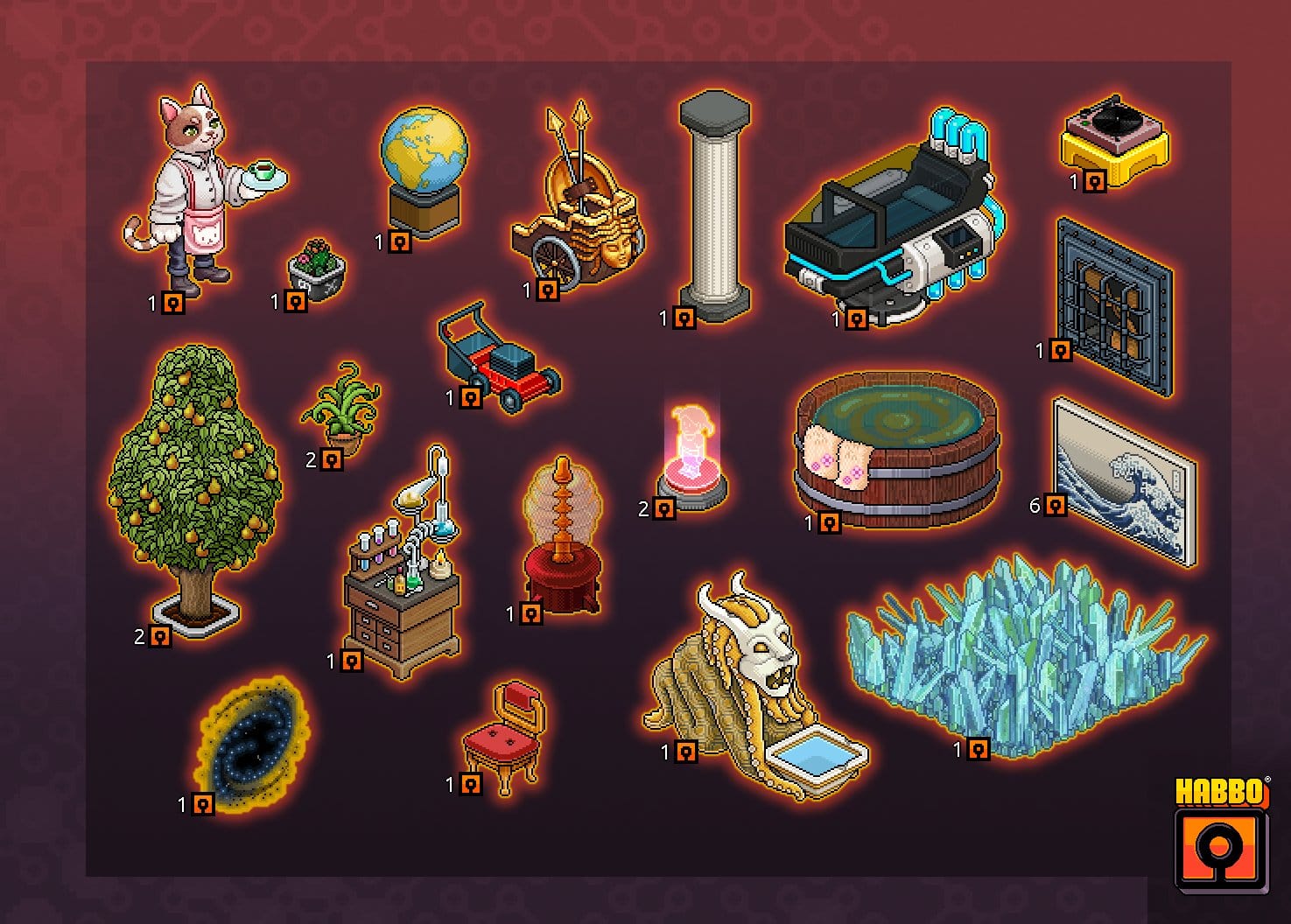 Estas reliquias están desbloqueadas, es decir, se pueden usar en TODOS los hoteles de Habbo, incluyendo Habbo X. Además, se pueden comprar y vender a cambio de la criptomoneda de ETH en el mercado de TokenTrove.