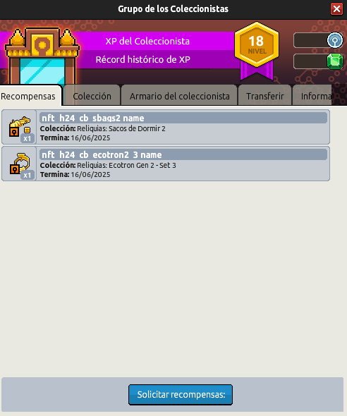 En el caso de la Collector Wallet, el reclamo se realiza en la herramienta del ‘Grupo de los Coleccionistas‘, dentro de la pestaña de ‘Colección‘ y seleccionando la opción de ‘Collector Wallet‘. Luego pulsa en el botón verde ‘Solicitar recompensa‘.