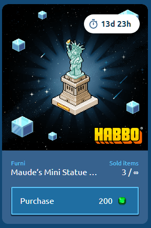 [COL] En venta: Mini Estatua de la Libertad de Maude Hace 2 años Dantempo 10 Popular Archivada Información de la publicación Publicada: 24/04/2024 13:05:02 H.P.E. Autor: Dantempo Último comentario:Nieblia Ir Visitas: 503 Información general Categoría: Furni en venta Tipo: Furni coleccionable Precio: 200 Fecha de inicio de venta: 24/04/2024 Fecha de final de venta: 08/05/2024 Lugar de venta: Tienda de Coleccionables Imágenes del ítem y de la Tienda de Coleccionables Ir a la Tienda de Coleccionables
