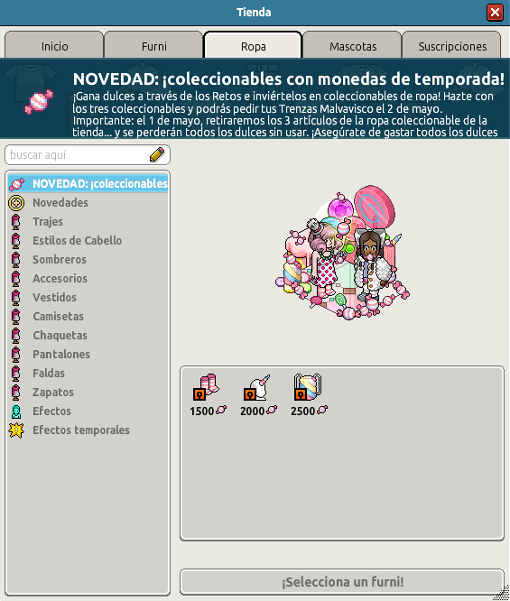 [COL] En venta: Prendas Malvavisco Hace 2 años Dantempo 10 Popular Archivada Información de la publicación Publicada: 16/04/2024 13:00:48 H.P.E. Autor: Dantempo Último comentario:Nieblia Ir Visitas: 402 Información general Categoría: Prendas en venta Tipo: Prendas coleccionables Precio: Entre 1500 y 2500 Fecha de inicio de venta: 16/04/2024 Fecha de final de venta: 01/05/2024 Lugar de venta: Catálogo Imágenes de las prendas y del catálogo