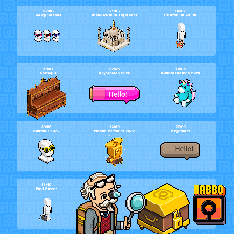 Para saber los ítems coleccionables que conforman cada uno de los sets coleccionables, puedes consultarlos en el apartado ‘Collectibles‘ de la página web oficial de Habbo Collectibles o dentro de Habbo, en el icono de ‘Coleccionables‘ y en la pestaña de ‘Colección‘.
