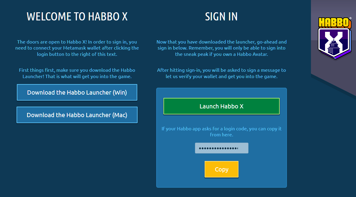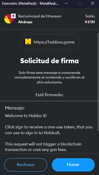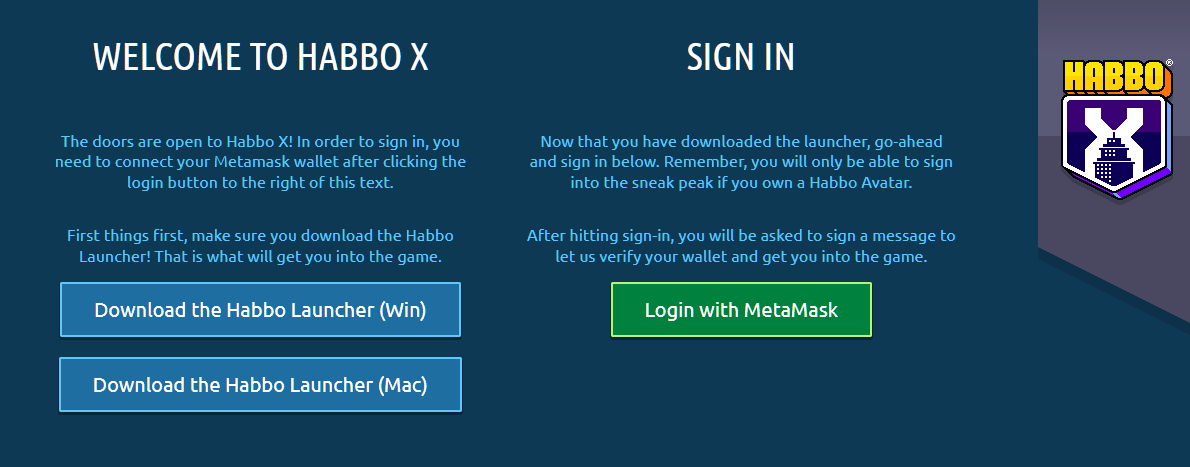Accede a la web oficial de Habbo X (https://www.habbox.game/) y haz clic en el bot贸n amarillo 芦Enter Habbo X禄. Si no tienes instalado el launcher de Habbo debes descargarlo pulsando el bot贸n azul 芦Download the Habbo Launcher禄 dependiendo de tu sistema operativo. A continuaci贸n, da clic en el bot贸n verde 芦Login with Metamask禄 y pulsa en el bot贸n 芦Firmar禄 de la ventana emergente.