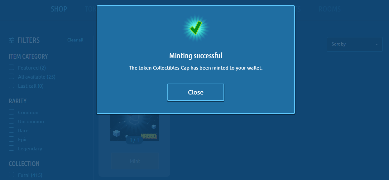 Accede a la web oficial de la tienda de Habbo Coleccionables (https://collectibles.habbo.com/shop/) y escribe el c贸digo en el recuadro blanco. A continuaci贸n, pulsa el bot贸n azul 芦Apply禄. Luego haz clic en el bot贸n azul 芦Mint禄 y pulsa en el bot贸n 芦Firmar禄 de la ventana emergente.