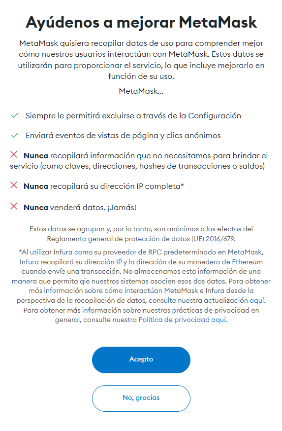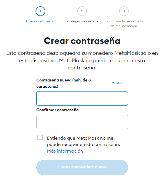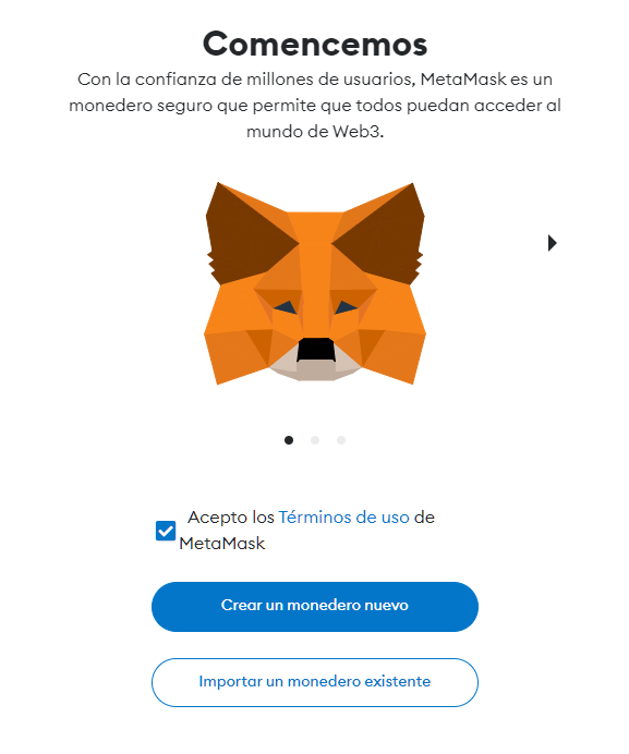 Ingresa en la extensi贸n o en la aplicaci贸n, acepta los t茅rminos de uso de Metamask y da clic en el bot贸n azul 芦Crear un monedero nuevo禄. Luego, pulsa el bot贸n azul 芦Acepto禄 y crea una contrase帽a segura que deber谩s escribir cada vez que quieras acceder a la extensi贸n o a la aplicaci贸n.