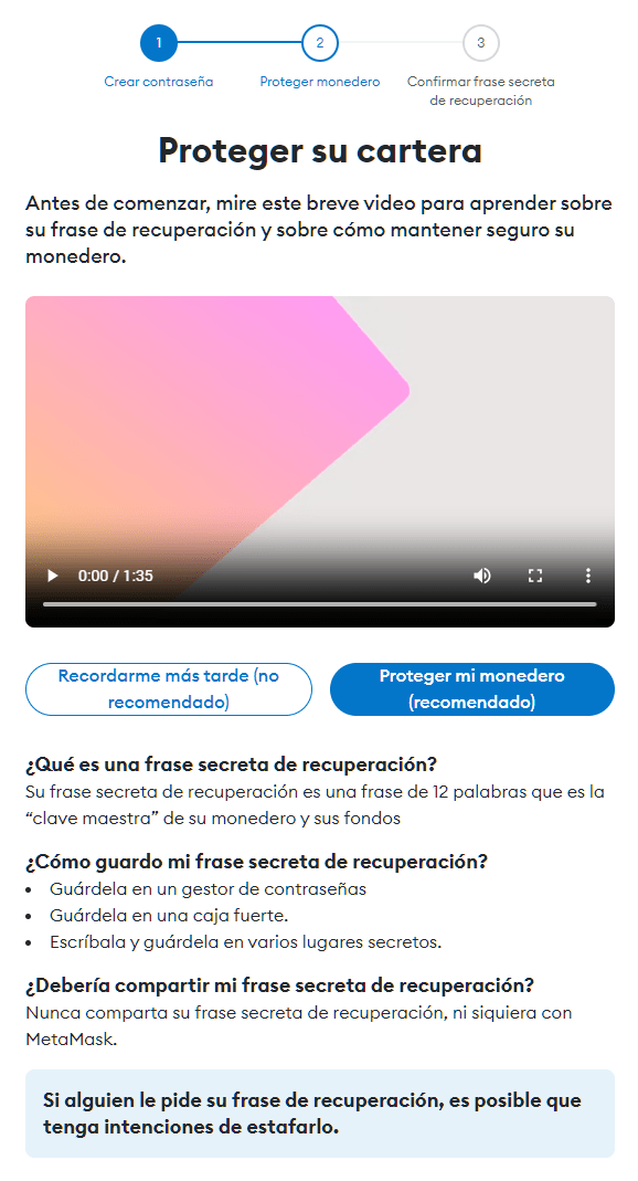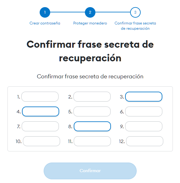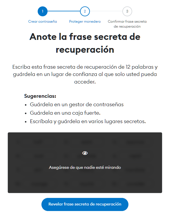 A continuaci贸n, haz clic en el bot贸n azul 芦Proteger mi monedero禄 y debes escribir la frase secreta de recuperaci贸n en un lugar seguro. Esta frase est谩 formada por doce palabras aleatorias que est谩n enumeradas: debes anotarlas en el mismo orden que te aparecen. Por 煤ltimo, deber谩s escribir tres de las doce palabras para confirmar la frase secreta de recuperaci贸n, tambi茅n conocida como seed o semilla.