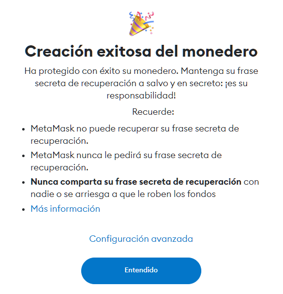 La frase secreta de recuperaci贸n es lo 煤nico que te permitir谩 recuperar tu cartera de Metamask en el caso de que olvides la contrase帽a, tu dispositivo tenga una aver铆a, etc. An贸tala en un papel y gu谩rdalo en un lugar seguro de tu domicilio que vayas a recordar: si la apuntas digitalmente podr铆as perderla o que te roben esa informaci贸n junto con tu cartera de Metamask. No compartas tu semilla con nadie.