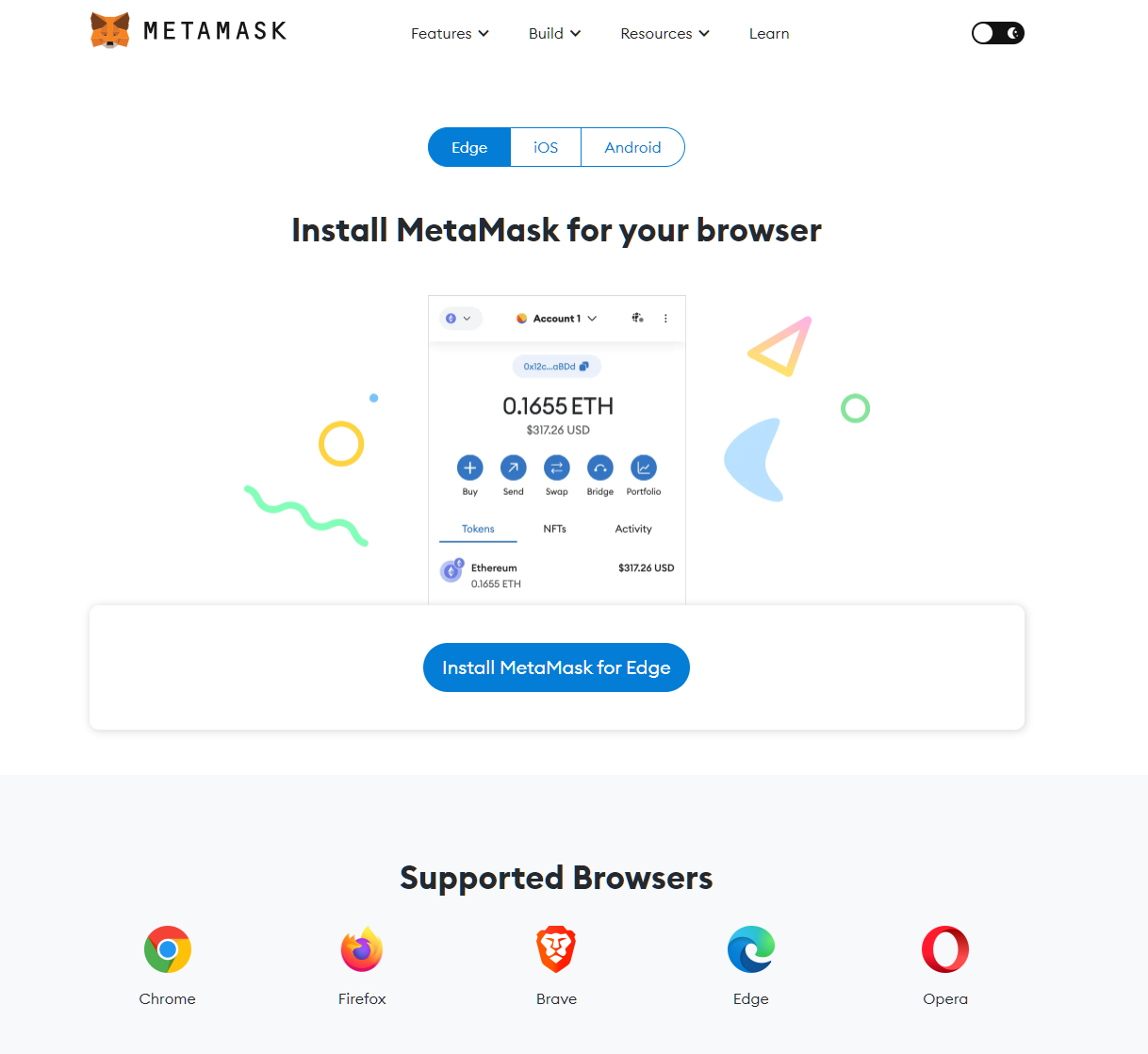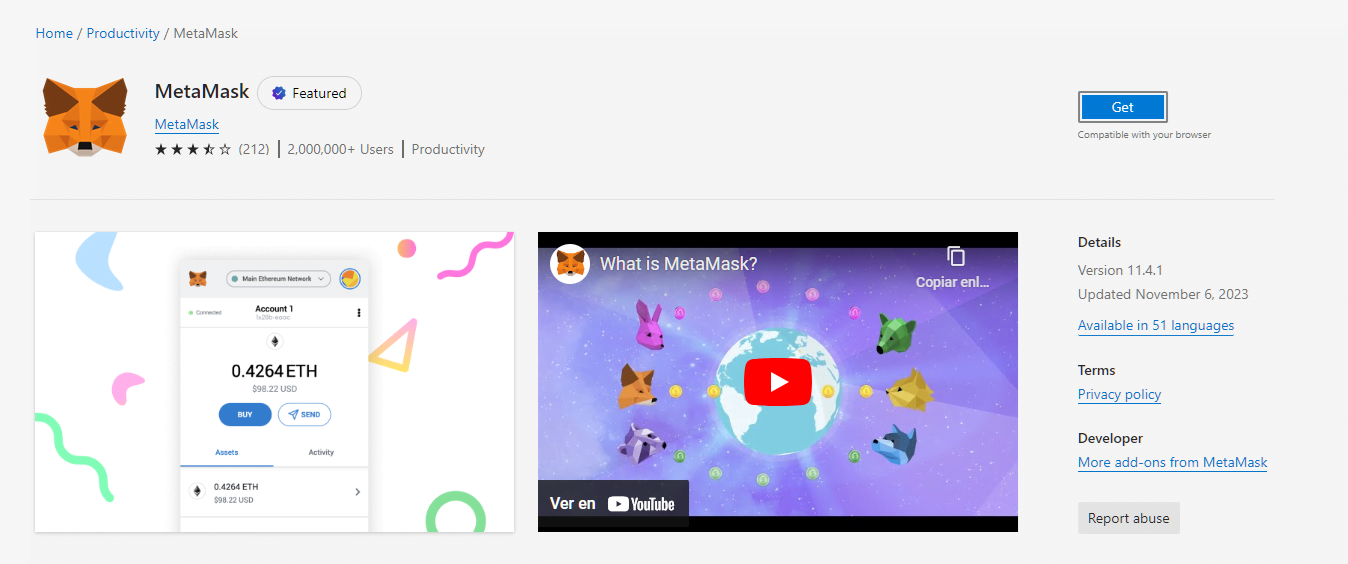 Accede a la web oficial de descarga de Metamask (https://metamask.io/es/download/) y pulsa el bot贸n azul 芦Instalar MetaMask para…禄 y descarga la extensi贸n (ordenador de sobremesa o port谩til) o la aplicaci贸n (smartphone con sistema operativo iOS o Android).