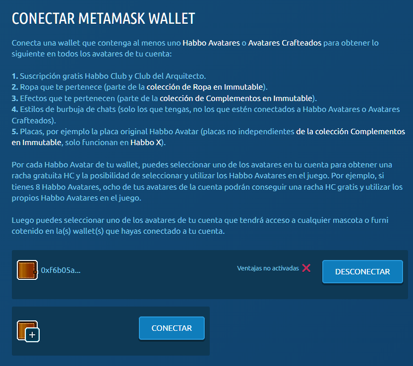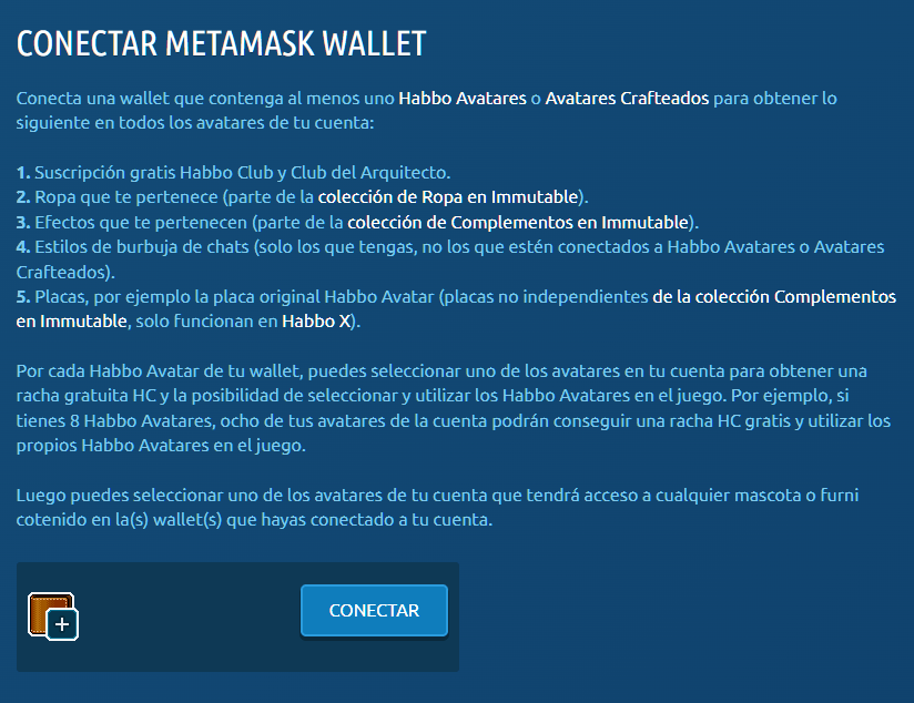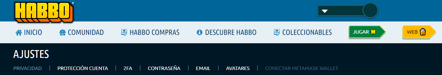 Entra en la página web de Habbo (https://www.habbo.es/) e inicia sesión. A continuación, entra en «Ajustes» y luego haz clic en la pestaña «Conectar Metamask Wallet» y pulsa el botón azul «Conectar»: