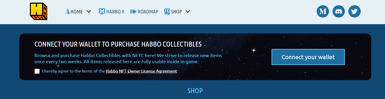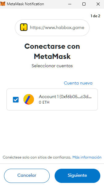 Entra en la página web de Habbo Coleccionables (https://collectibles.habbo.com/shop/) y pulsa el cuadrado para aceptar los términos de Habbo NFT y haz clic en el botón azul «Connect your wallet». Después da clic en los botones azules «Siguiente» y «Conectar» de las ventanas emergentes que aparecerán: