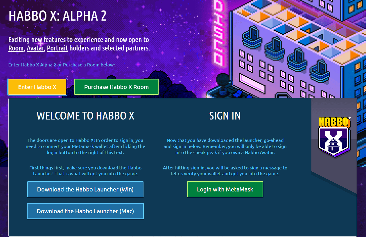 Entra en la página web del hotel Habbo X (https://www.habbox.game/) y haz clic en el botón amarillo «Enter Habbo X» y en el botón verde «Login with MetaMask». Luego pulsa los botones azules «Siguiente» y «Conectar» de las ventanas emergentes: