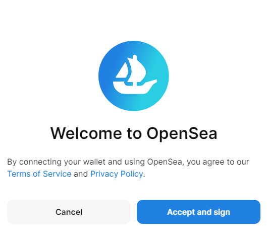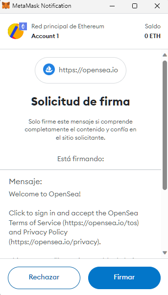 Entra en la página web de OpenSea (https://opensea.io/) y pulsa el botón «Login» que está en la esquina superior derecha. Luego selecciona «Metamask» y haz clic en los botones azules de «Siguiente», «Conectar» y «Firmar» de las ventanas emergentes. Por último, da clic en el botón azul «Accept and sign»: