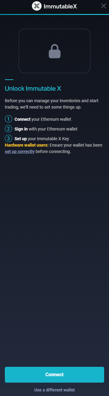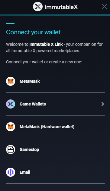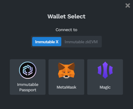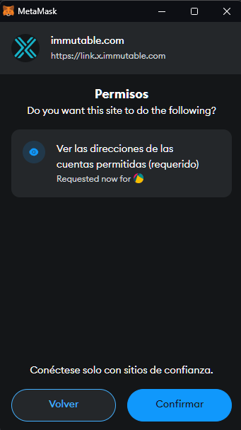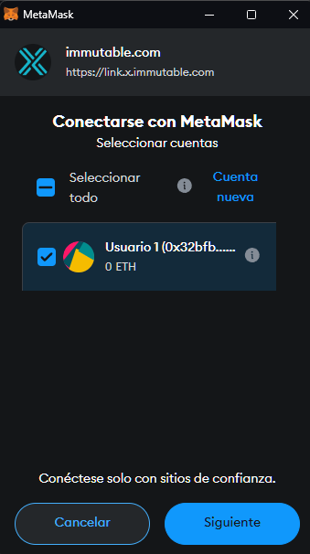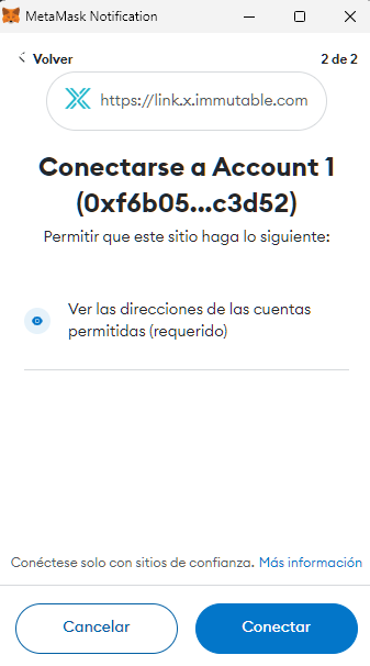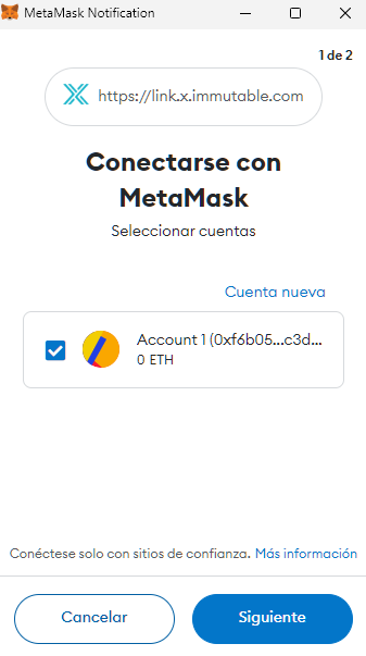 Entra en la página web de Immutable X (https://market.immutable.com/) y pulsa el botón azul «Connect Wallet» que está en la esquina superior derecha. Luego selecciona «Metamask» y después ve pulsando los botones azules «Siguiente» y «Conectar» de las ventanas emergentes que irán apareciendo: