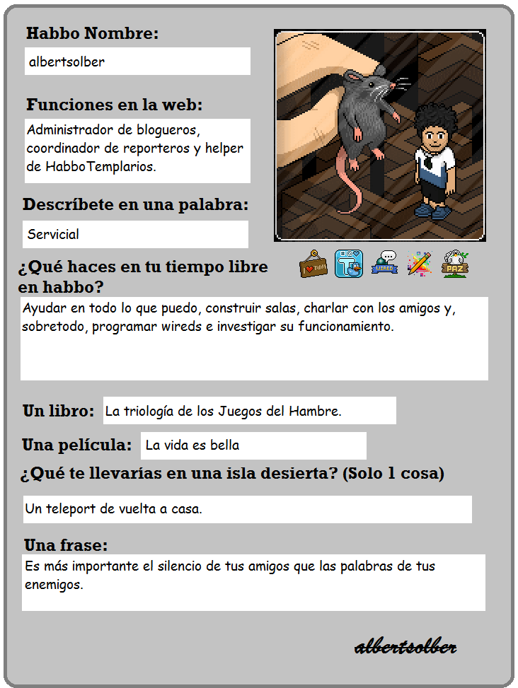 Los Templarios queremos saber qué opinan ustedes de albertsolber. ¿Están de acuerdo con la descripción que dimos nosotros de él? ¿Te esperabas estas respuestas u otras? ¡Sigue atento a HabboTemplarios y no olvides dejar un comentario!