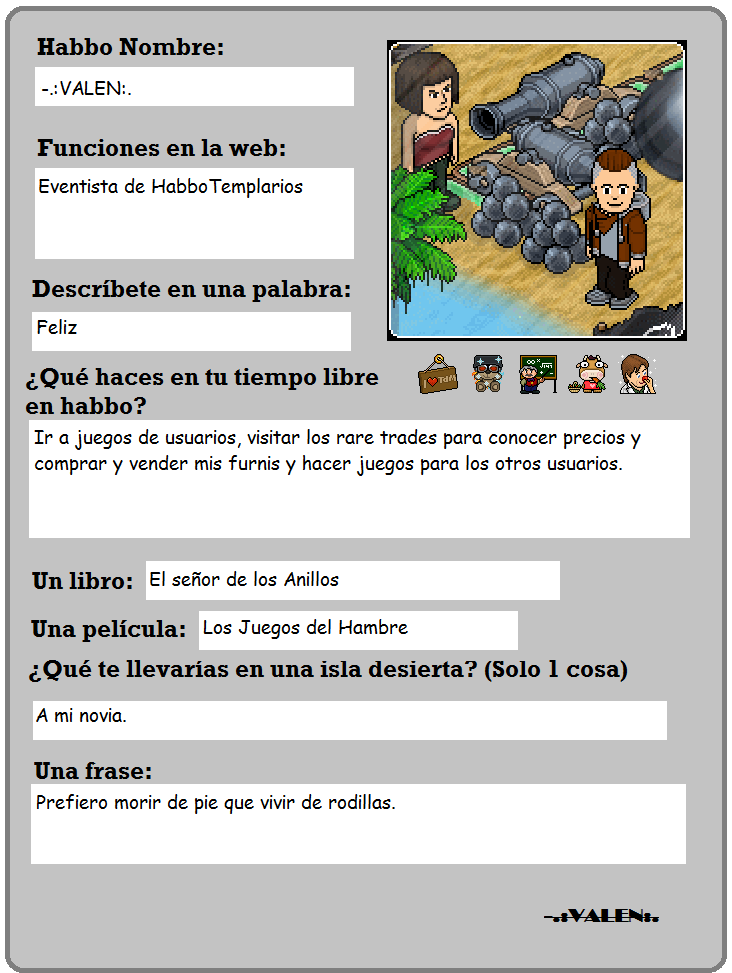 ¿Te gustaría saber más que él? ¿Quieren que añadamos alguna otra pregunta a las fichas de los templarios? HabboTemplarios es una web llena de información, blogs y diversión ¡Sigue atento y déjanos en los comentarios todo lo que nos quieras decir!