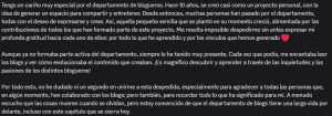 Podría afirmar que hemos tenido más de 50 blogueros, y más de 1200 ediciones diferentes, donde cada uno ha dejado un recuerdo, un blog, una huella es por eso que quiero aprovechar para dar las gracias a todos los que en algún momento decidieron entrar en este maravilloso departamento GRACIAS.