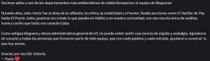 Este departamento ha estado desde los inicios de Habbotemplarios, el 12 de abril del 2015 de la mano de Albertsolber (cuando aún no éramos ni oficiales) que se subió el primer blog de La voz de Habbo hablando un poco con los usuarios sobre las novedades en el hotel. En estos 10 años hemos tenido blogs de todo tipo, sobre habbo: wired, construcciones, bromas… y otros fuera de habbo: consejos, películas, series, animales, lugares del mundo…, pero sobre todo también nos hemos caracterizado por tener grandes blogs de historias y aventuras: como no olvidar el vomitando palabras o mi querido Nubecín con el crea tu historia.
