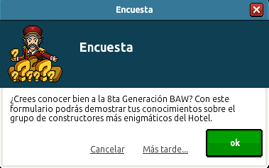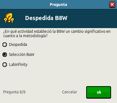 Primeramente deberás acceder a la sala Despedida B8W de la staff Sefos, y a continuación saldrá una encuesta, pasados unos segundos, que deberás responder de la siguiente manera:
