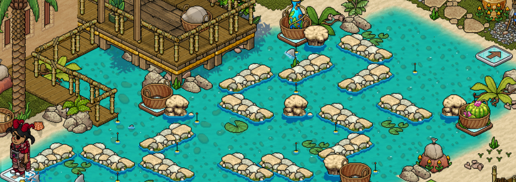 Deberás pasar por los embarcaderos de piedra para ir formando el camino hasta llegar a cada cesta.