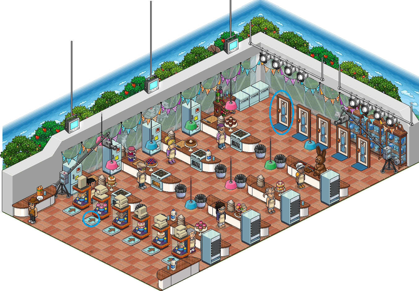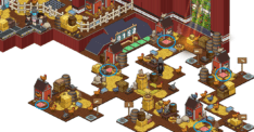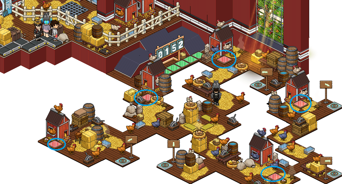 En esta sala deberemos esperar la cola, y una vez que nos toque jugar deberemos pisar todas las casillas de color rojo que hay al lado de los gallineros, pero con cuidado ya que si las gallinas púrpuras te tocan, volverás al medio del juego. Una vez que consigas pisar las cinco casillas, debes hacer click en alguna palanca…Todo esto en 2 minutos.