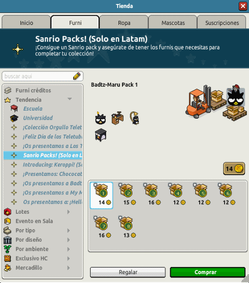 Tal y como leíste anteriormente, llegaron 8 packs de furnis de las colecciones que hemos disfrutado por meses: Hello Kitty, Chococat, Badtz-Maru y My Melody. Se encuentran agrupados en packs que contienen 3 o 4 furnis, y sus precios varían entre los 12