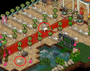 Una vez hayas ingresado al terreno de juego tendrás que sentarte en una silla con otro usuario y tendréis 1 minuto para hacer que el amor fluya. Cuando el tiempo acabe, un termómetro del amor se llenará y esa pareja será la que pase al siguiente juego. Si consigues pasar esta primera sala recibirás la siguiente placa: