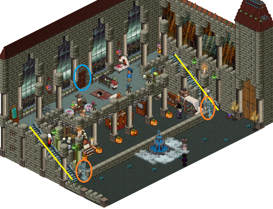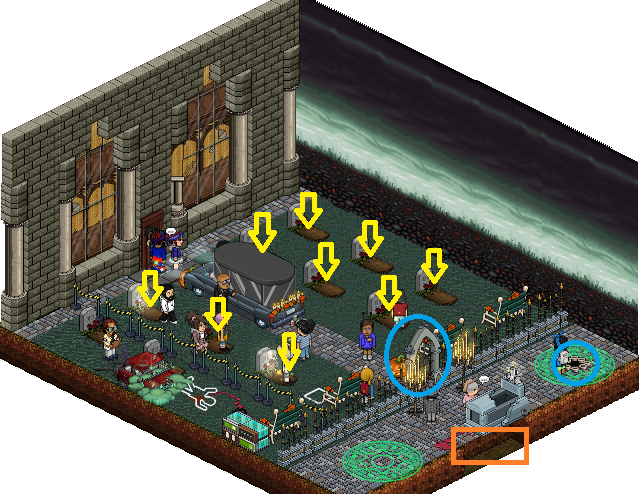 7.- Deberás formar un esqueleto donde está el rectángulo naranja, justo debajo de la tumba, y para poder formarlo debes decir en las tumbas que tienen una flecha amarilla encima *escarbar huesos*, sin que te toquen dos calabazas que se mueven por la sala.