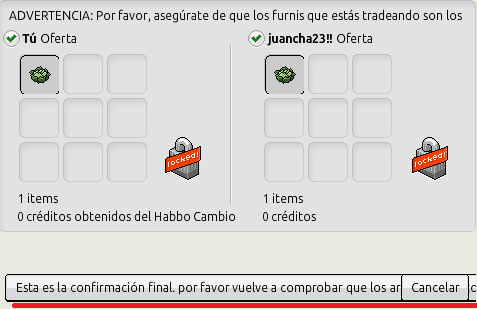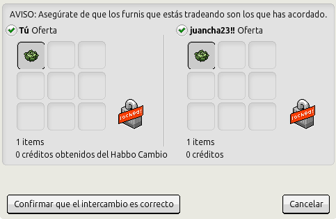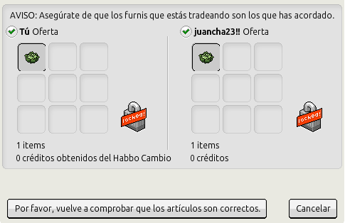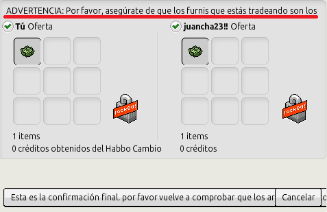 ADVERTENCIA: Por favor, asegúrate de que los furnis que estás tradeando son los artículos que has acordado tradear. El tradeo es bajo tu responsabilidad.