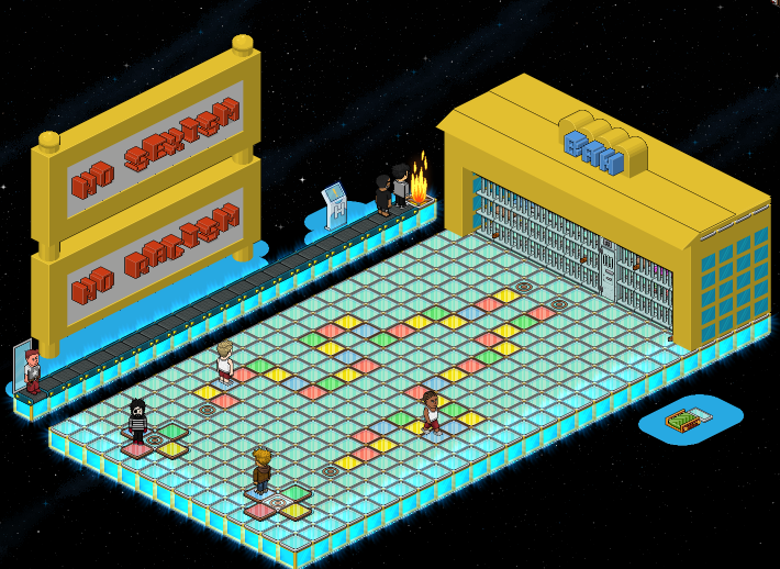 En esta sala deberemos esperar nuestro turno en la cola de rollers. Cuando nos llegue el momento de jugar deberemos mover al bot pisando las casillas color correspondiente (si la siguiente por la que debe pasar es una amarilla pisaremos la amarilla, así sucesivamente). Una vez hayamos llevado el bot hasta el final recibiremos la placa unos segundos después ¡Paciencia!