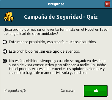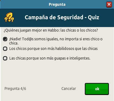 La Seguridad es un tema que le preocupa mucho a Habbo y no se cansarán de hacer eventos para concienciarnos de lo importante que es tanto la seguridad como el respeto. Por ello, hoy acaba de abrir una sala en donde podremos conseguir hasta cuatro placas: tres de ellas mediante juegos y la última mediante una encuesta que te resolveremos más adelante: