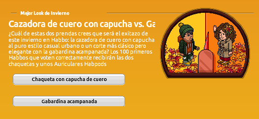 Con la entrada de la campaña Aires de Invierno, además del lote de sala que ya se encuentra a la venta, tenemos disponible un nuevo Reto de la Comunidad en el que podremos votar por uno de los looks que tendrá mayor éxito en Habbo. Se trata de una Cazadora de cuero con capucha o una elegante Gabardina.