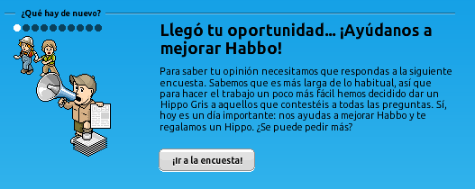 Hoy, los staff de habbo han dejado una noticia en la vista del hotel de nuestro cliente de habbo informando de una nueva encuesta para mejorar Habbo. La encuesta es larga y un poco cansada, pero al final una recompensa te espera: Un magnífico Hippo Gris.
