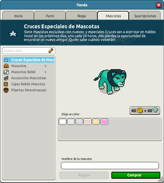 Debes dirigirte al catálogo y pinchas en la sección Mascota, y desde ahí podrás adquirir un total seis especies, distintas, de leones. Tiene un precio de 40