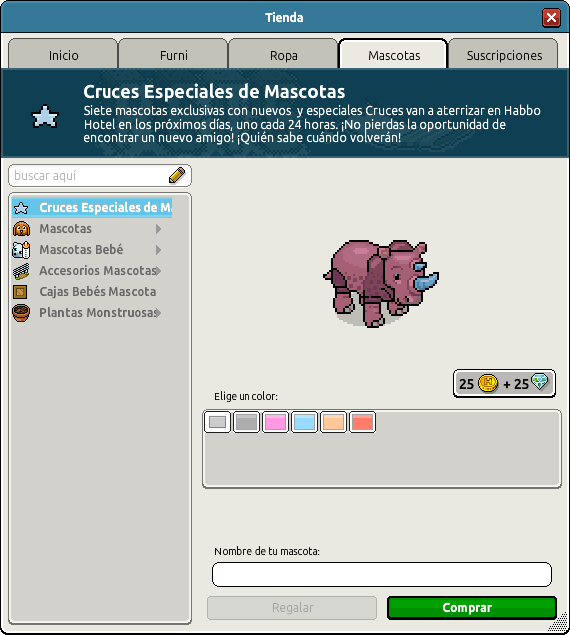 Debes dirigirte al catálogo y pinchas en la sección Mascota, y desde ahí podrás adquirir un total seis especies, distintas, de rinocerontes. Tiene un precio de 25