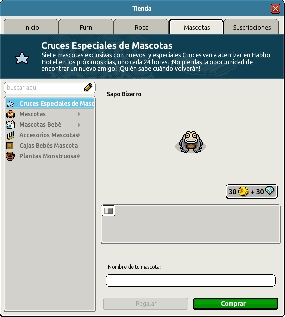 Las mascotas son esos animalitos que nos acompañan y nos animan cuando estamos tristes. Son leales a sus dueños y en Habbo sucede exactamente lo mismo. Como bien sabes, desde hace varios días Habbo está sacando cruces de mascotas especiales. Desde hoy podrás adquirir la Sapo durante 24 horas.