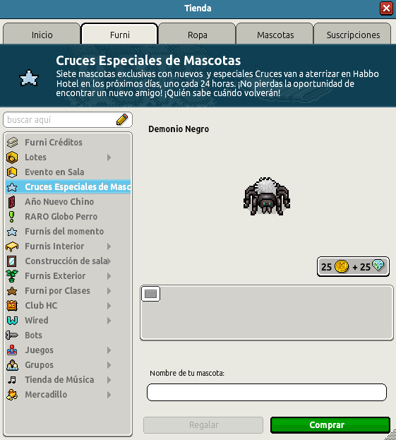En esta ocasión podrás conseguir un Demonio negro, y durante estos días podrás conseguir siete mascotas exclusivas con especiales cruces, uno cada 24 horas. ¡No te las pierdas! Hoy podrás adquirir una única especie, al precio de 25