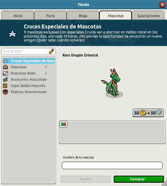 En esta ocasión podrás conseguir un Dragón Oriental, y durante estos días podrás conseguir siete mascotas exclusivas con especiales cruces, uno cada 24 horas. ¡No te las pierdas! Hoy podrás adquirir una única especie, al precio de 50