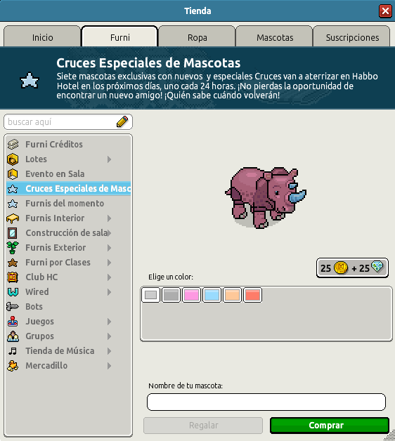 En esta ocasión podrás conseguir un rinoceronte ¡No te pierdas las mascotas! Hoy podrás adquirir una única especie, al precio de 25