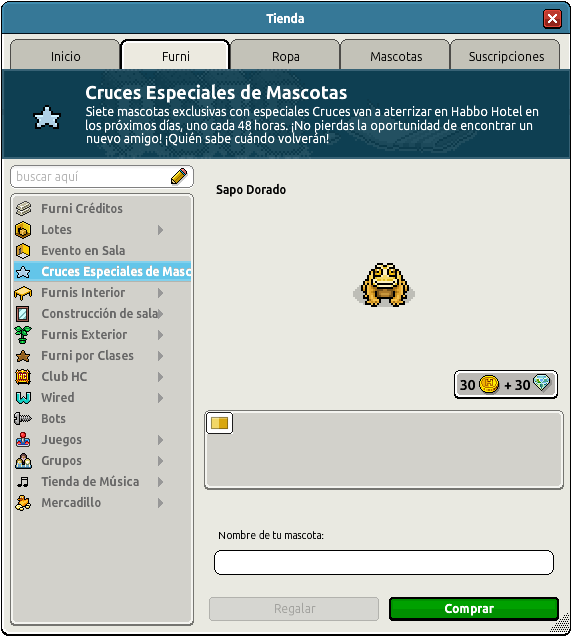 En esta ocasión podrás conseguir una Rana, y durante estos días podrás conseguir siete mascotas exclusivas con especiales cruces, uno cada 24 horas. ¡No te las pierdas! Hoy podrás adquirir una única especie, al precio de 30