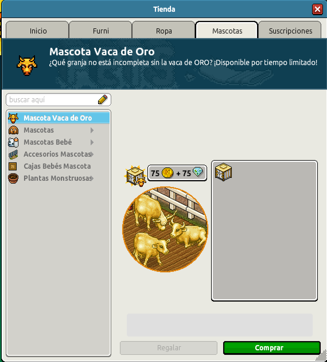 En esta ocasión podrás conseguir una Vaca de Oro, y durante estos días podrás conseguir siete mascotas exclusivas con especiales cruces, uno cada 24 horas. ¡No te las pierdas! Hoy podrás adquirir una única especie, al precio de 75