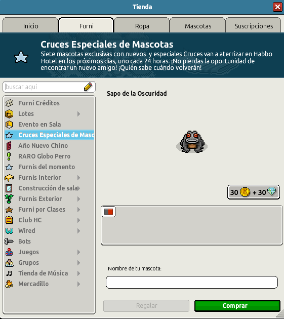 En esta ocasión podrás conseguir un sapo, y durante estos días podrás conseguir siete mascotas exclusivas con especiales cruces, uno cada 24 horas. ¡No te las pierdas! Hoy podrás adquirir una única especie, al precio de 30