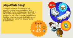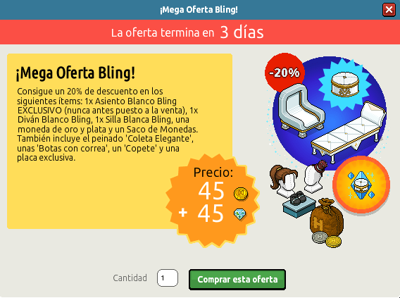 Las novedades en Habbo no paran de llegar. Hoy mismo hemos sabido que ya está disponible una mega oferta en Habbo con la que podremos hacernos con varios peinados, algunos créditos, furnis bling exclusivos y una placa como prueba de su adquisición. Podremos hacernos con esta oferta hasta tres veces por usuario por el módico precio de 45