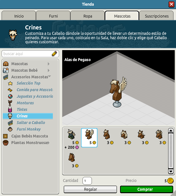 Para que tu caballo sea el más guapo y salte como nunca, Habbo ha lanzado durante 24h las Alas Pegaso. Con estas alas tu caballo saltará mucho más y ¡será el mejor en las competiciones de saltos! Veamos una imagen para ver qué precio tienen las alas y dónde podemos comprarlas: