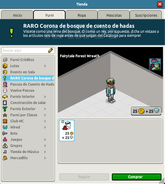Vístete como una reina del bosque. O como un rey, por supuesto. ¡Echa un vistazo a los artículos de ropa raro antes de que dejen el Catálogo para siempre! Podrás hacerte con una corona de bosque por el precio de 25
