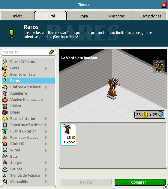 Tras un buen tiempo sin ponerse en venta este tipo de furnis, esta vez ha sido el turno de la ventolera bombón, la cual estará a la venta en el catálogo durante un tiempo limitado al precio de 25